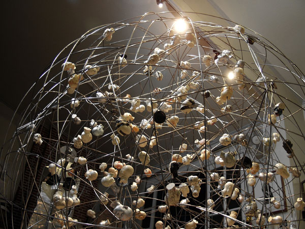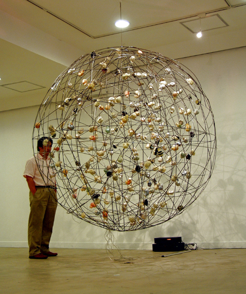 시장에서 채록한 소리를 스무 개가 넘는 스피커를 통해 들려주고 있는 <인간의 소리>는 마치 소리를 전달하는 케이블처럼 사람들을 휘감고 있는 선들과 다양한 문자가 기록된 사람의 얼굴들로 구성된 투과성의 구체(具體)가 삶의 현장임을 드러낸다. 가까이서 집중해야 간신히 알아들을 수 있는 다양한 소리들이 서로 마구 뒤섞여 있는 까닭에 당장은 소음으로만 인식되지만 이것이야말로 우리가 일상적으로 경험하는 소리들의 진상(眞相)이자 삶 그 자체의 증거이다.