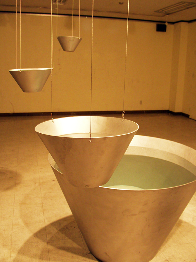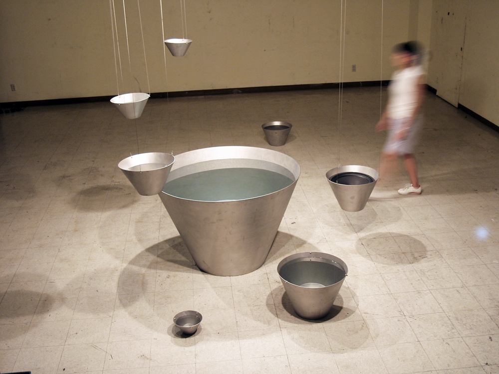 소리는 공기 속에서 일어나는 에너지의 변화로서 파동에 의하여 운반되는 것은 물질이 아니고 에너지이기 때문에 크기, 세기, 속도를 지니며 일반적으로 그 세기는 단위시간 안에 단위면적을 통과하는 에너지로 표시한다. 다시 말해서 공기가 없는 진공상태에서는 소리가 발생하지 않는다. <물의 소리>는 소리가 지닌 이러한 속성을 시각적으로 잘 보여준다. 즉 스피커로부터 흘러나오는 소리의 파장이 수면에 물결의 파장을 일으키도록 의도된 이 작품은 비가시적인 소리를 가시적인 것으로 바꿔놓고 있는 것이다.