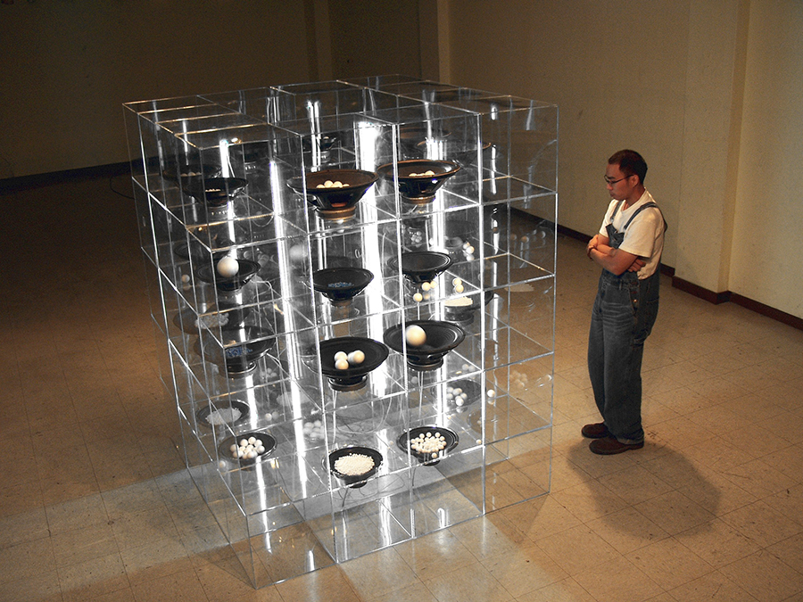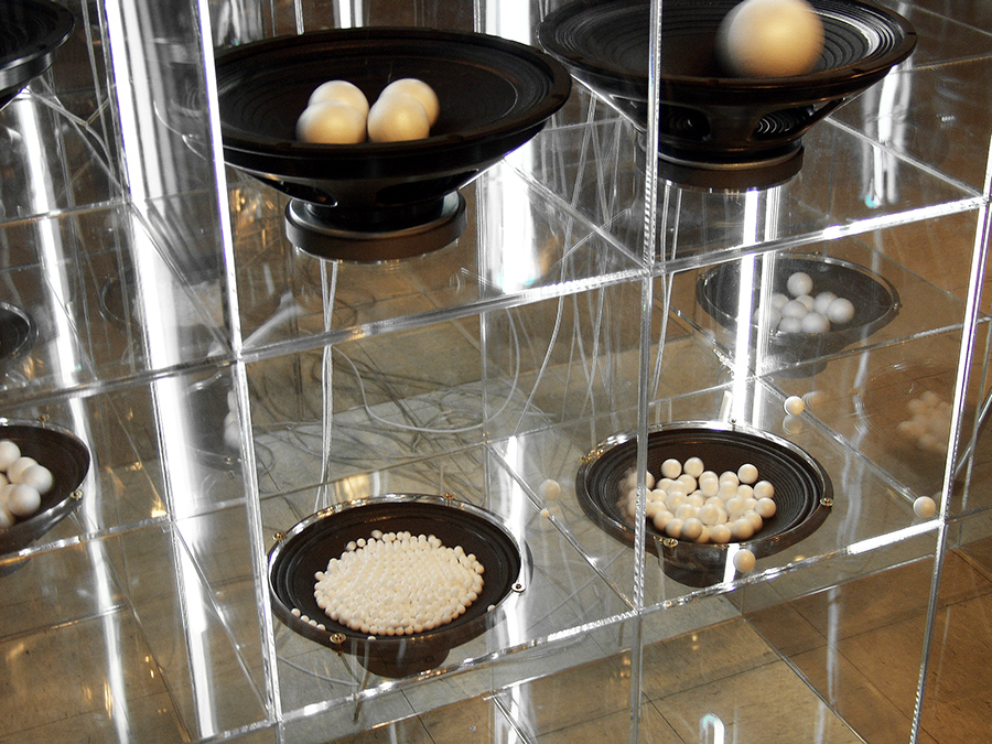 ‘소리’를 주제로 한 김석의 작품 중에서 <무게의 소리>는 스피커로부터 전달되는 파동(波動)에 의한 물질의 운동을 다루고 있다. 소리란 음파가 공기라는 매질(媒質)의 밀도변화를 통해서 전달되는 신호를 말하는데 사실 우리 인간이 공기에 싸여 살아가는 것과 마찬가지로 소리에 포위돼 있다고 해도 과언은 아닐 것이다. 대기 중에서 공기의 밀도 차이는 감지할 수 있을지언정 그것의 무게는 거의 느끼지 못하는 것처럼 소리의 세기는 느끼더라도 그 무게를 측정하는 것이 단순한 일은 아닐텐데 작가는 그것을 ‘무게의 소리’란 수사(修辭)를 사용하며 위트 있게 표현하고 있다. 앰프에서 전달된 신호가 스피커에서 증폭됨으로써 스피커 위에 올려놓은 가벼운 물체가 마치 가열된 팬에 놓여진 콩이 그 표면 위에서 튀듯 통통 튀는 현상을 이용한 이 작품이야말로 강도(强度)는 있을지언정 질량은 없다고 믿는 우리의 상식을 뒤엎고 있는 것이다.